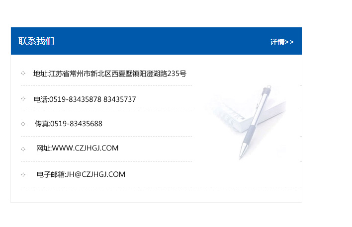 地址:常州市新北區友邦商務大廈1幢16、17層  電話:0519-85101652  傳真:0519-85112595  郵編:213022  網址:www_cz-jiayue_cn.dlbocheng.com  郵箱:xiajifengaa@163.com
